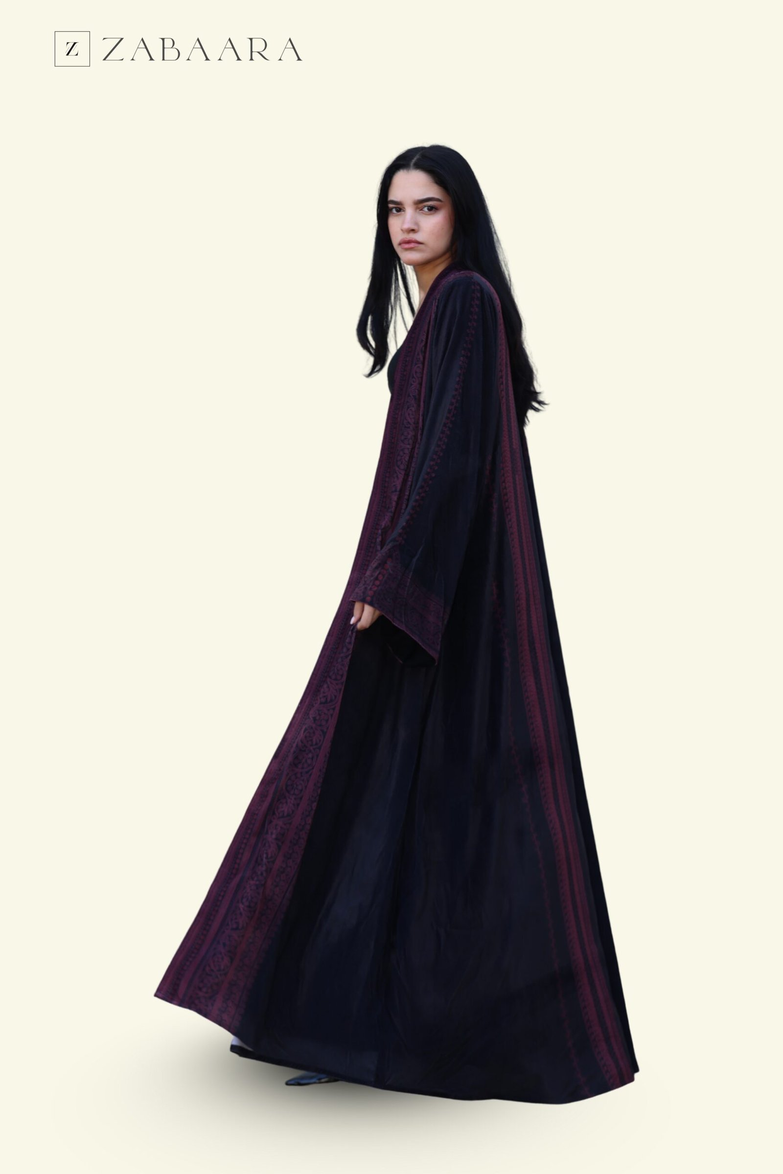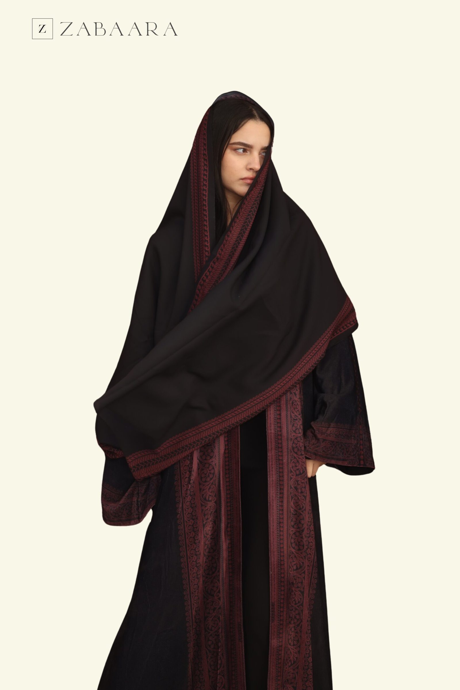 Black with Burgundy Soft Embroidery Velvet Abaya
